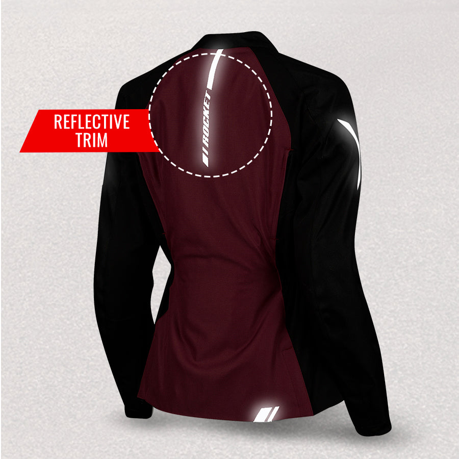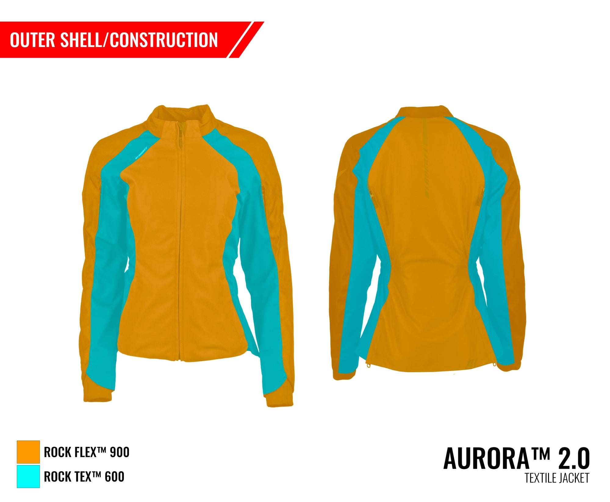 The Aurora 2.0 women's motorcycle jacket from Joe Rocket Canada®is constructed with a combination Rock Tex™ 600 outer shell and Rock Tex™ 900 stretch panels.