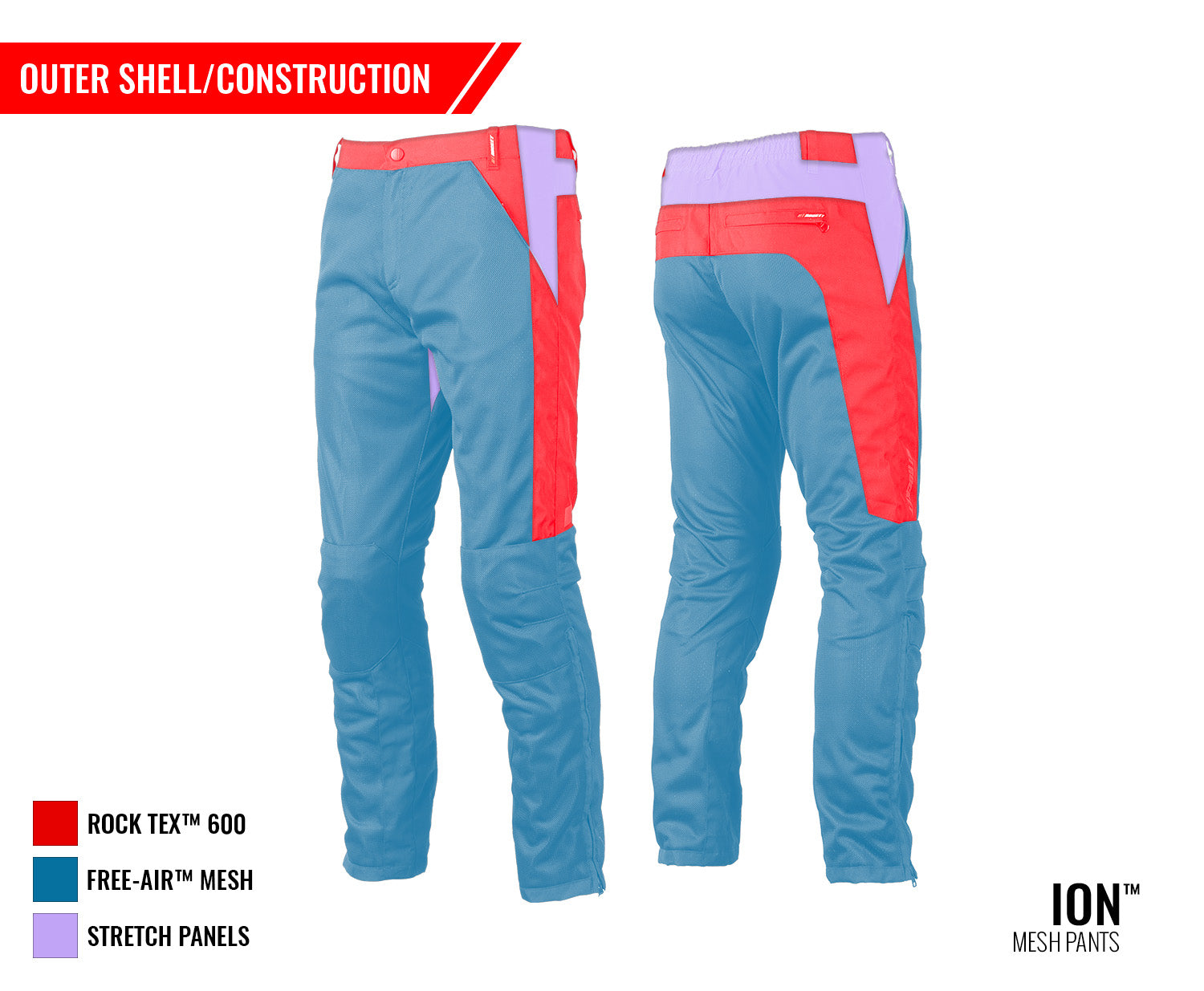 Designed to keep the heat at bay, the Joe Rocket Canada® ION™ mesh motorcycle pants deliver cool running performance in hot and humid riding conditions. Constructed with a high-flow Free-Air™ mesh frame with Rock Tex™ 600 reinforcements, these pants deliver the perfect balance of ventilation and abrasion resistance.