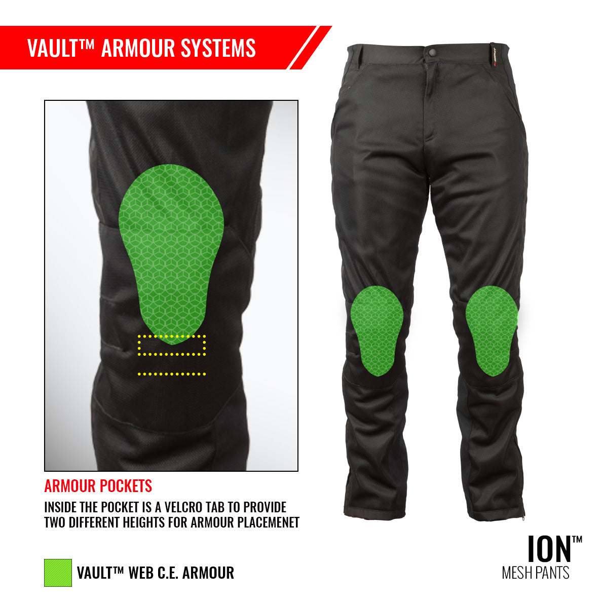 Each pair of riding pants comes equipped with a set of removable and adjustable Vault™ C.E. Level 1 knee protectors. Pockets for optional Vault™ Flex hip armour.