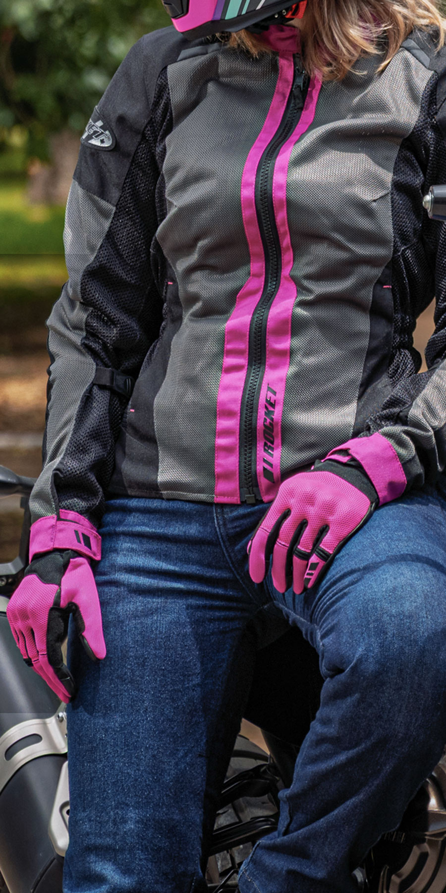 Designed for warm-weather riding, the Joe Rocket Canada® Stratos™ women's mesh motorcycle gloves are built with a Free-Air™ mesh outer shell that provides maximum airflow to keep hands cool on hot rides. The hidden knuckle protector adds impact protection without adding all the bulk, while the premium leather palm allows for a durable grip.