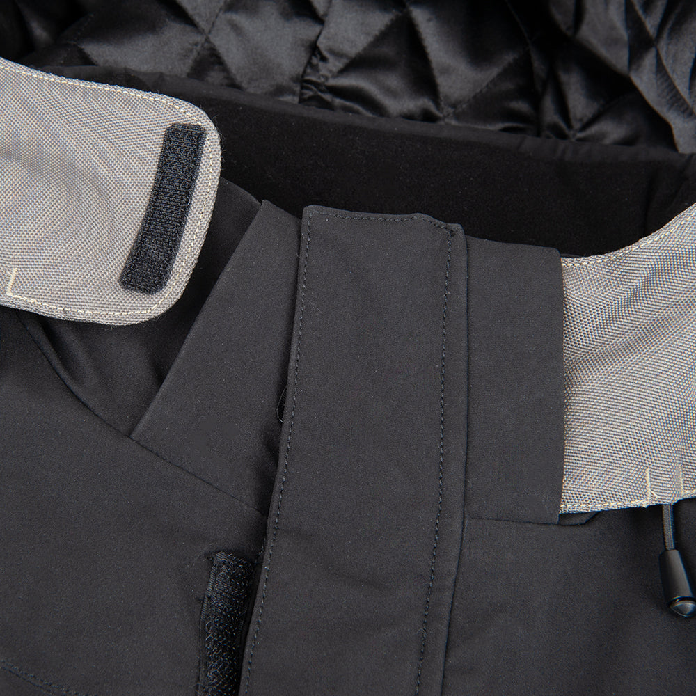 Strap and snap adjusters in the waist and/or sleeves for tightening and loosening fit.