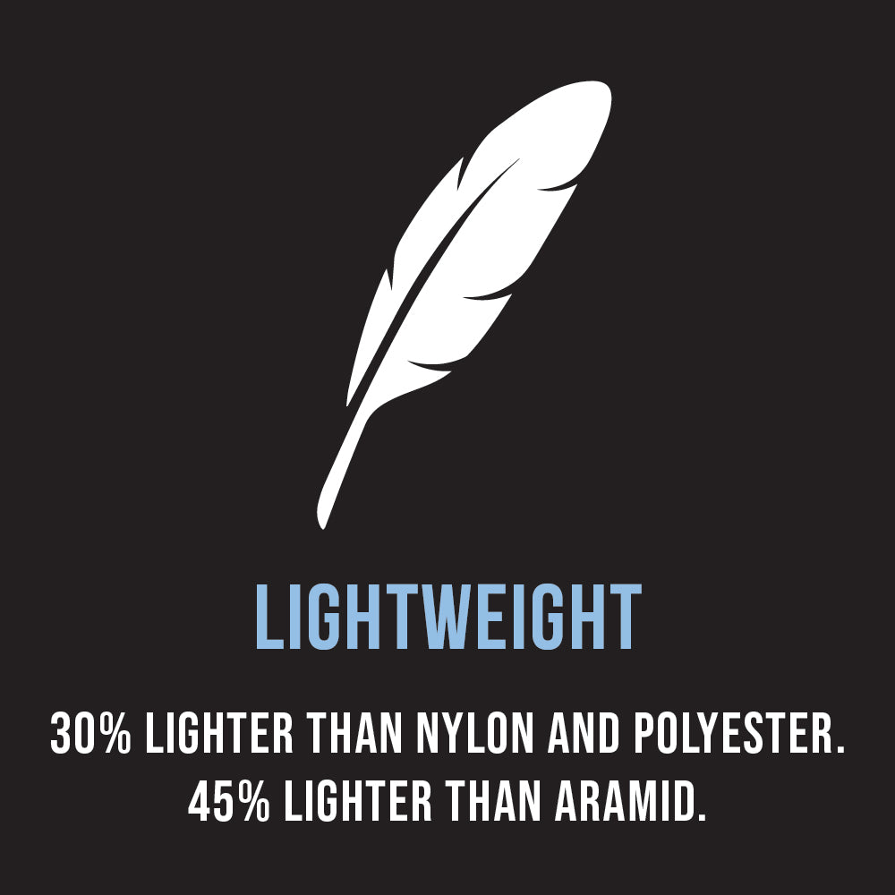 30% lighter than nylon and polyester. 45% lighter than aramid.